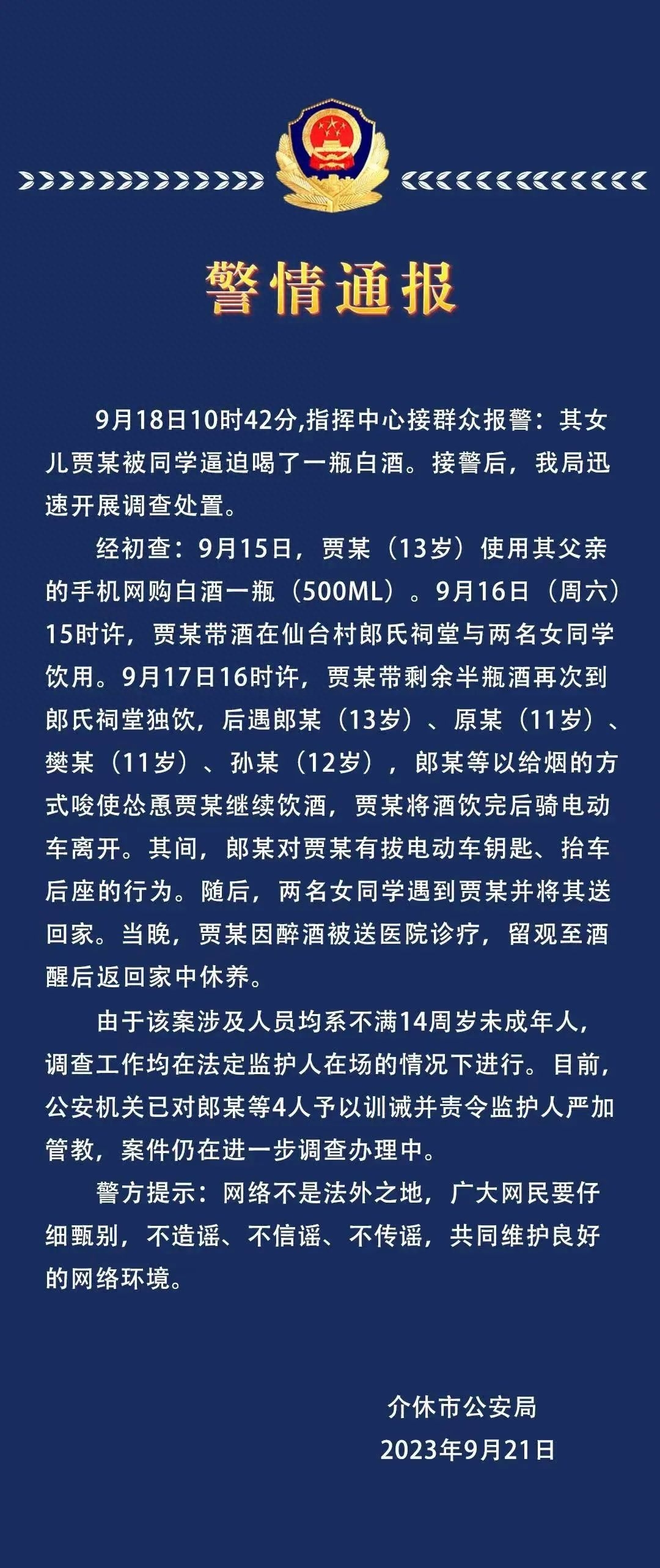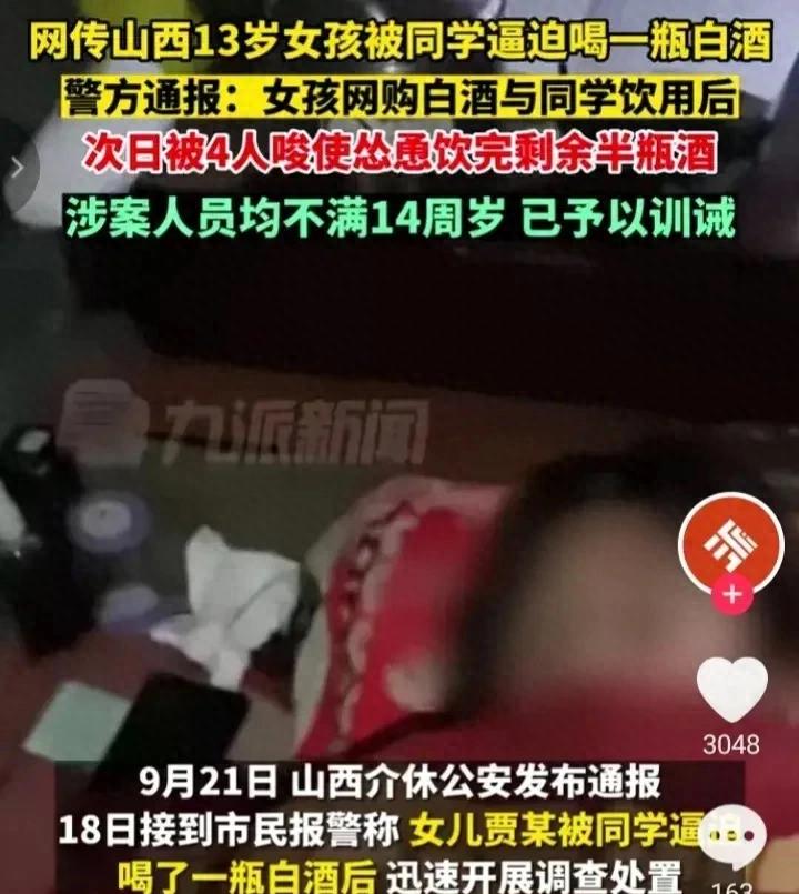 这起事件发生在山西省介休市张兰村,四名男生诱骗女学生喝下了半瓶白酒,随后夺走了她的电动车钥匙。幸运的是,另外两名女同学及时赶到,将她送回家。然而,当女学生陷入昏睡状态时,家长感到不安,迅速将她送往医院确保她的安全。