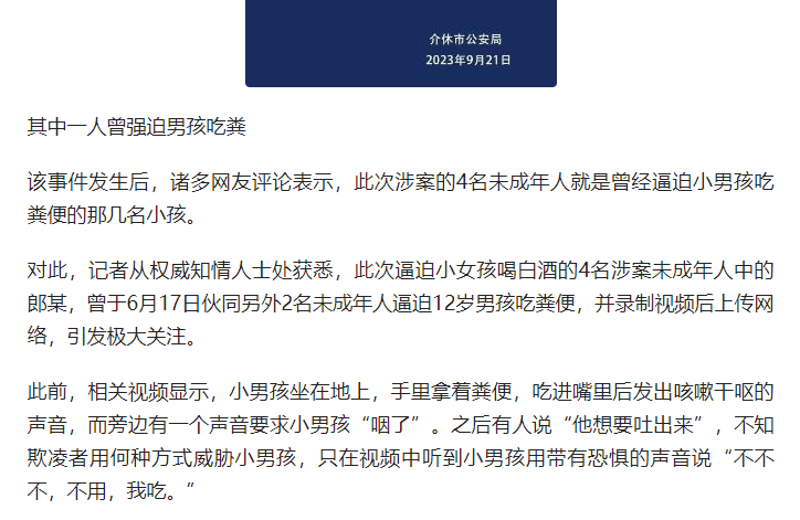 令人震惊的是,其中一名男孩曾在今年月与两名未成年人一起逼迫一名岁男孩吃粪便,并将视频上传到网络。然而,由于他们均未满周岁,根据我国法律,他们不受刑事追责,只能责令监护人严加管教,学校对他们给予了记过处分。