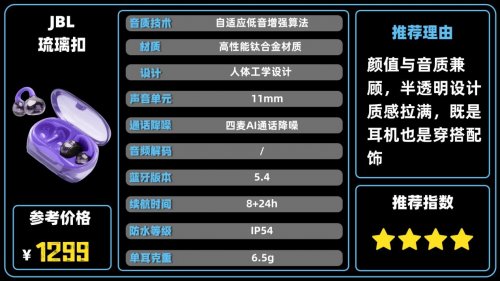 JBL这款琉璃扣主打卡通潮流,光颜值就戳中了很多人。充电盒和耳机都用了半透明设计,能直接看到内部的精密结构,科技感和艺术感都在线,摆在桌上像个小摆件,平时不听歌也能当耳饰戴,搭配衣服特别出彩。一共有五种配色可选,不管是男生还是女生,都能找到适合自己的款式,辨识度也很高,戴出去不容易撞款。