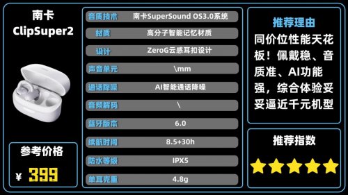 推荐理由:同价位性能天花板!佩戴稳、音质准、AI功能强,综合体验妥妥逼近千元机型