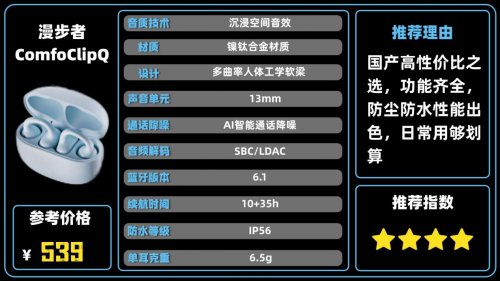 漫步者在国产音频领域深耕多年,口碑一直不错,这款ComfoClipQ主打高性价比,不到三百五的价格,功能却很全面。颜值在线,有多种颜色可选,机身小巧精致,不管是男生还是女生戴都合适。佩戴上采用了创新耳夹设计和云感技术,重量轻盈,能贴合耳廓轮廓,大多数耳型都能适配,戴起来稳固,长时间戴也不会觉得累。