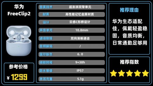 推荐理由:华为生态适配佳,佩戴轻盈稳固,音质均衡,日常通勤足够用