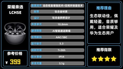 推荐理由:生态联动佳,佩戴轻盈,音质够用,适合荣耀及华为生态用户