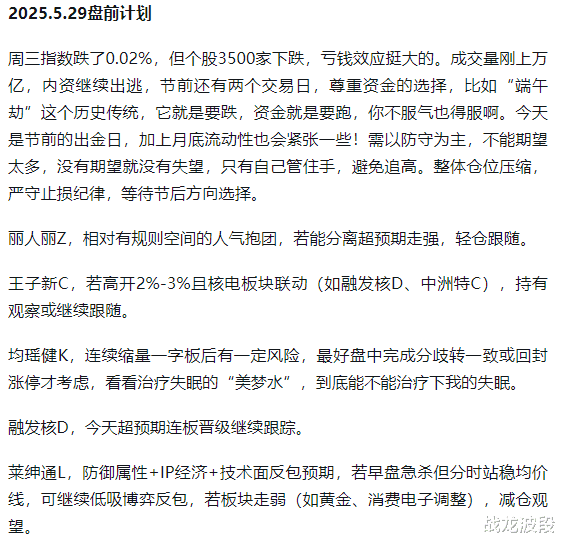 A股永远不按套路出牌,往年的端午都叫做“端午劫”,但昨天A股终于硬了一把。昨天开盘计划想着防守为主,竞价出来以后,市场情绪很好,而且量能放大,这里感觉跟判断不相符,但还是很谨慎,所以昨天丽人丽Z,王子新C,融发核D,这些都没去。明明看到核电弱转强,却下不去手加仓,王子新C甚至还减仓了大半,尾盘王子新C和融发核D居然都拉涨停了,真的拍肿大腿。均瑶健K则继续一字不给机会,莱绅通L,因为担心指数跳水,开盘跌停位置加了一笔,下午拉升又跟随了一笔,结果尾盘直接被按在了地板上了,妥妥的做了一个反T。科新机D,继续滚动做了个T,仓位也不多,今天没异动的话也准备走了。唯一比较欣慰的是舒泰S,昨天居然给了20cm,自己也一直在滚动,这个票从5月22日盘前分享至今,就算不滚动,涨幅也高达了63个点,不知道大家有没有上车?