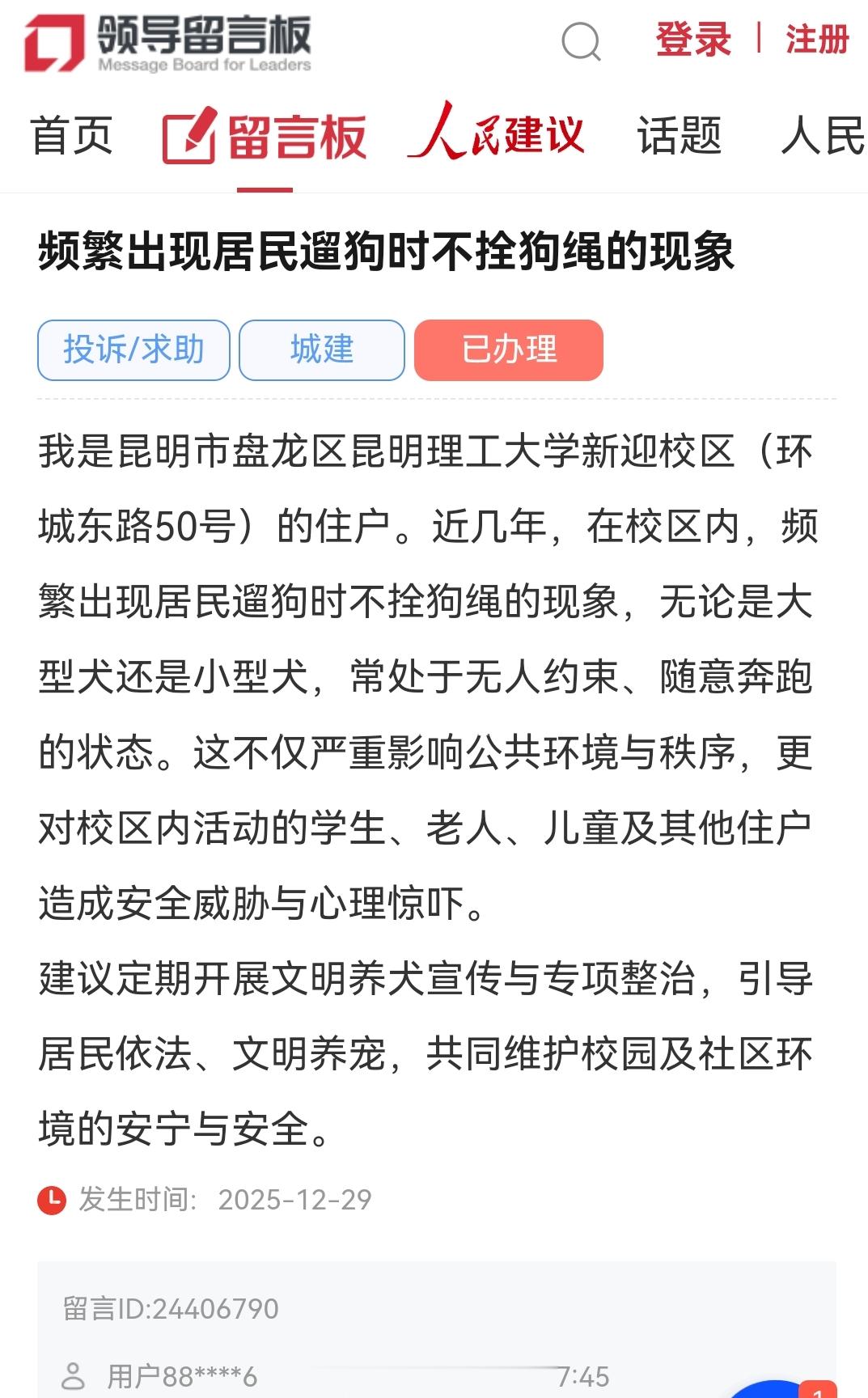 频繁出现居民遛狗时不拴狗绳的现象我是昆明市盘龙区昆明理工大学新迎校区(环城东路50号)的住户。近几年,在校区内,频繁出现居民遛狗时不拴狗绳的现象,无论是大型犬还是小型犬,常处于无人约束、随意奔跑的状态。这不仅严重影响公共环境与秩序,更对校区内活动的学生、老人、儿童及其他住户造成安全威胁与心理惊吓。