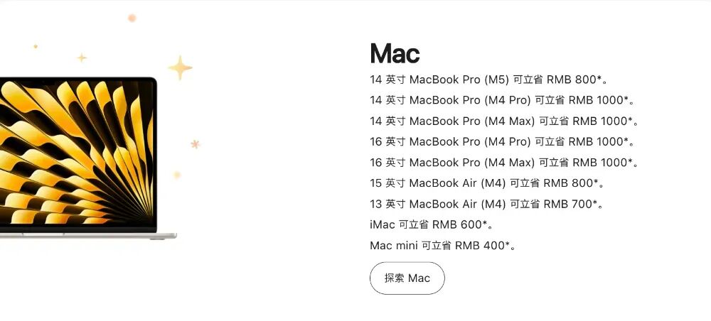 13 英寸 MacBook Air (M4) 可立省700 元、iMac 可立省 600 元、Mac mini 可立省 400 元。