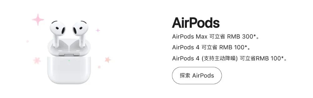 AirPods Max 可立省 300元、AirPods 4 可立省100元、AirPods 4 (支持主动降噪) 可立省 100元。