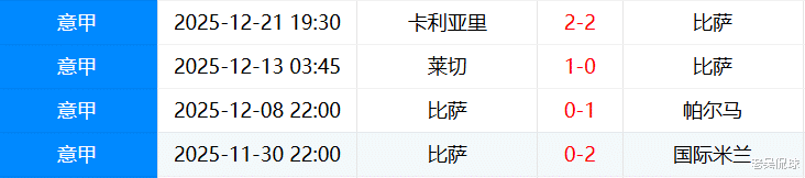 比萨客场2比2战平卡利亚里,结束了3连败,输给国米是实力使然,但连续0比1不敌帕尔马和莱切,都是6分大战,对保级影响不小,尽管保级压力不小,但主帅吉拉迪诺还是很有信心。俱乐部是打算利用冬窗补强,力争引进两名前锋、一名中场和一名后卫,当然,肯定是免费引进。当本场,只能依靠目前的阵容。