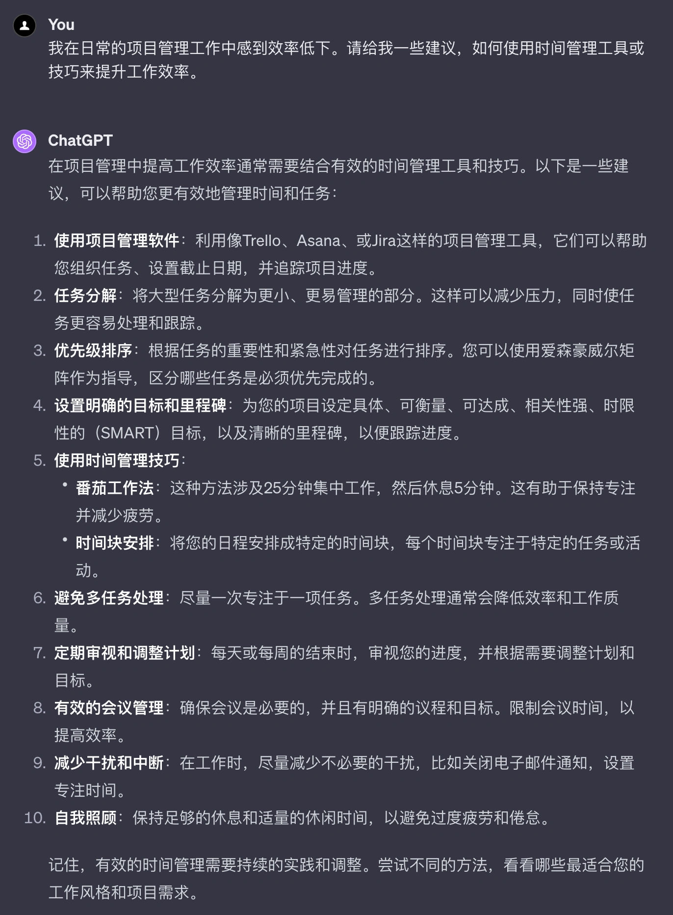 改进后的提问:“我在日常的项目管理工作中感到效率低下。请给我一些建议,如何使用时间管理工具或技巧来提升工作效率。”