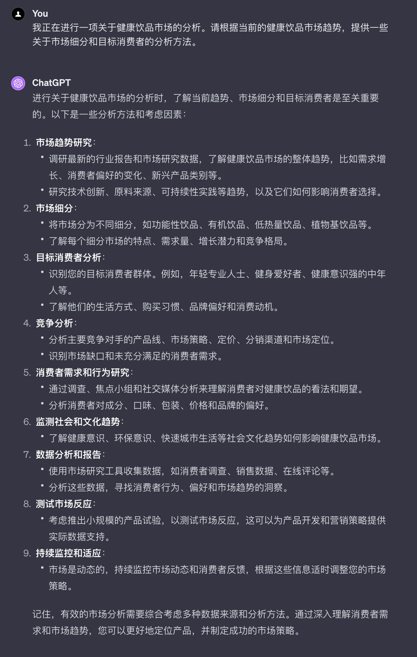 改进后的提问:“我正在进行一项关于健康饮品市场的分析。请根据当前的健康饮品市场趋势,提供一些关于市场细分和目标消费者的分析方法。”