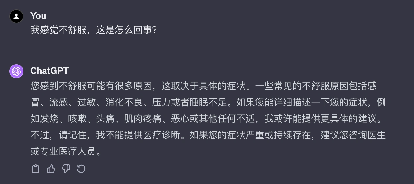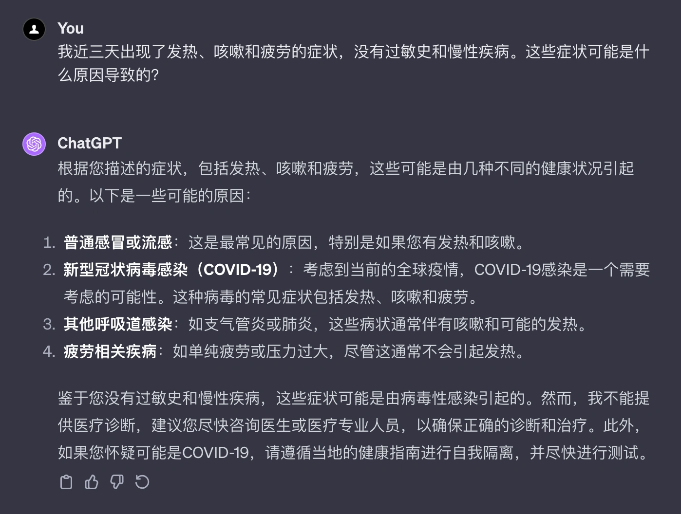 这里就增加的问题的背景细节“我近三天出现了发热、咳嗽和疲劳的症状,没有过敏史和慢性疾病。”,GPT 回答就更加有针对性