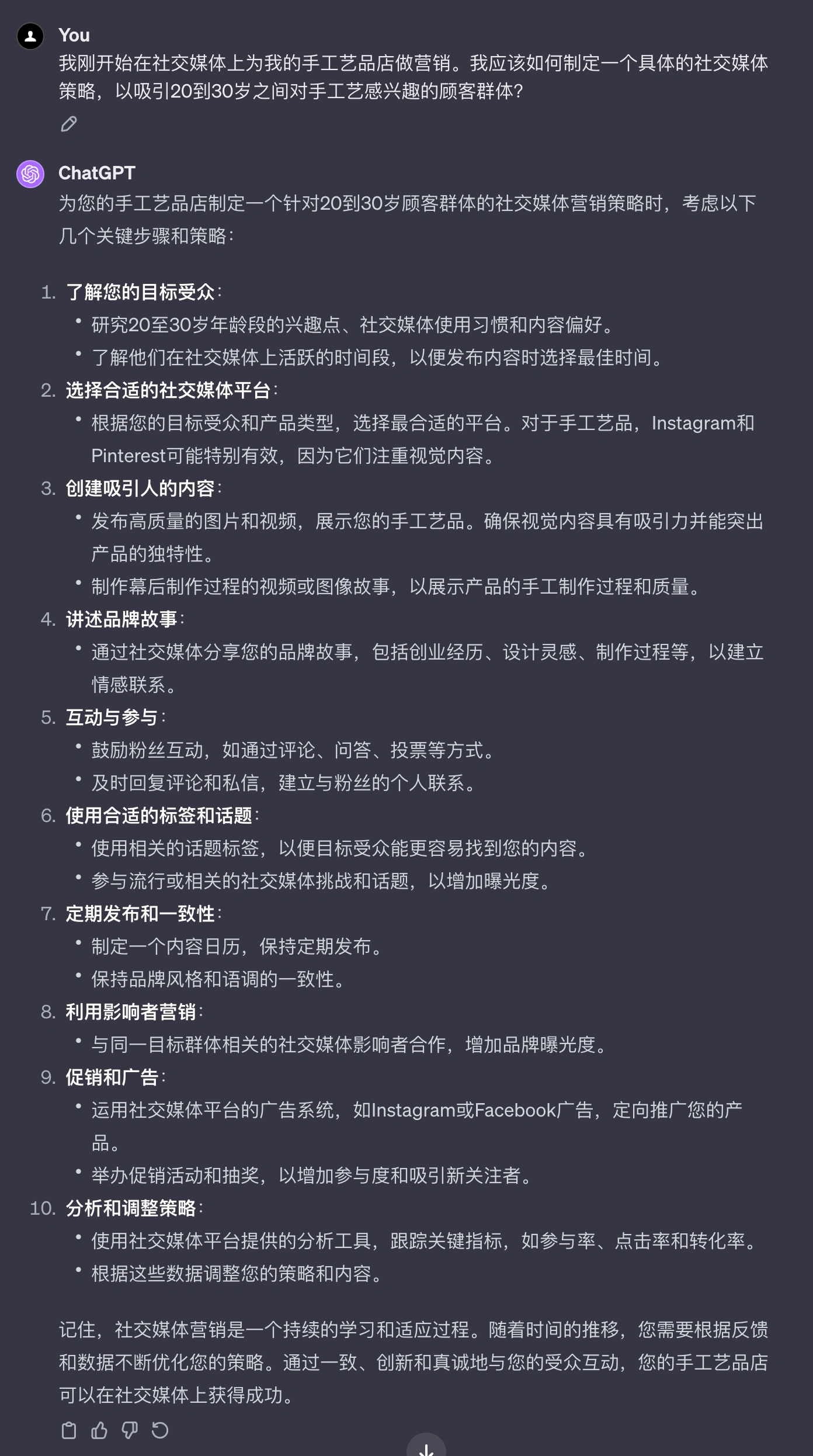 改进后的提问:“我刚开始在社交媒体上为我的手工艺品店做营销。我应该如何制定一个具体的社交媒体策略,以吸引20到30岁之间对手工艺感兴趣的顾客群体?”