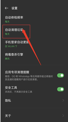 3、进入到手机管家设置页面后,点击【自动清理垃圾】。