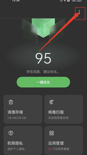 2、进入到手机管家主页面后,选择点击右上方的设置三个点。