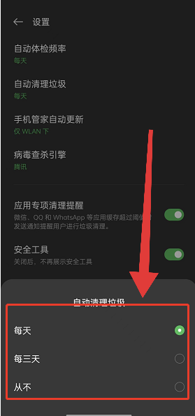 4、进入到自动清理垃圾页面后,选择自动清理时间天数即可了。