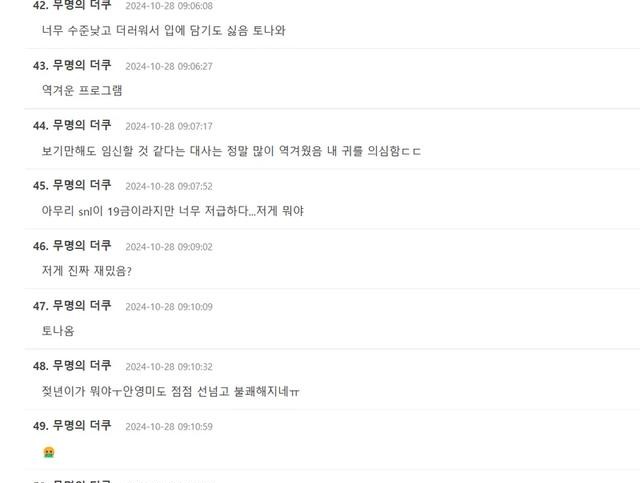 不少观众反映:这不是讽刺,是嘲弄特别是模仿剧中未成年角色时使用十九禁台词,许多人指责这已达到性骚扰的程度,并认为这种行为严重破坏了作品的形象。就有观众留言:非得用这么低俗的恶搞吗、恶心到无法忍受、这节目水准怎么会变这样、被告也毫不意外等,大量负面评价涌现。