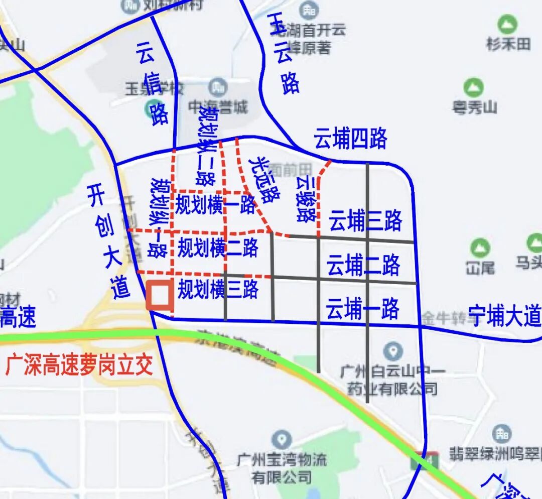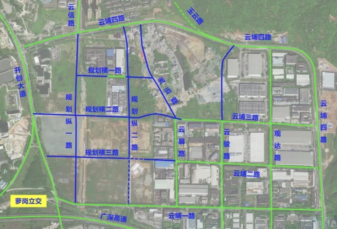 本项目位于开创大道以东,云埔一路以北,共包含7条道路,全长约5661米。其中:规划纵一路全长约1182米,规划纵二路全长约906米,规划横二路全长约1130米,云骏路全长约547米,均为城市次干道,双向4车道,设计速度40公里/小时,云骏路红线宽度26米、其他路红线宽度30米。