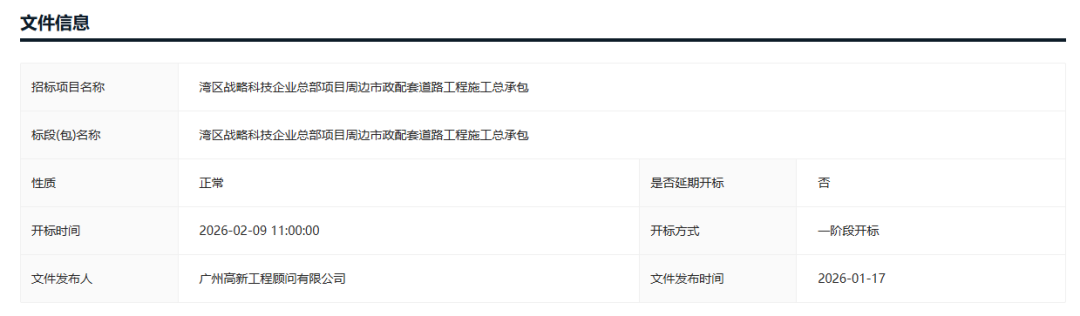 近日,湾区战略科技企业总部项目周边市政道路工程正式启动招标,最高投标限价达2.846亿元。