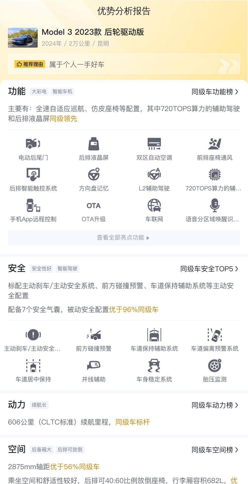 我们先来说说二手Model 3的优势。首先,价格优势显而易见。根据汽车之家等二手车平台的数据,2023款后轮驱动版Model 3的二手车价格普遍比新车便宜20%-30%,这对于预算有限的消费者来说无疑是一个巨大的吸引力。其次,特斯拉的品牌溢价较高,即使是二手车也保值率相对较高,未来出手也比较容易。再次,Model 3的智能化配置和驾驶体验在同级别车型中依然处于领先地位,即使是几年前的车型,在智能驾驶辅助、OTA升级等方面也依然具有优势。