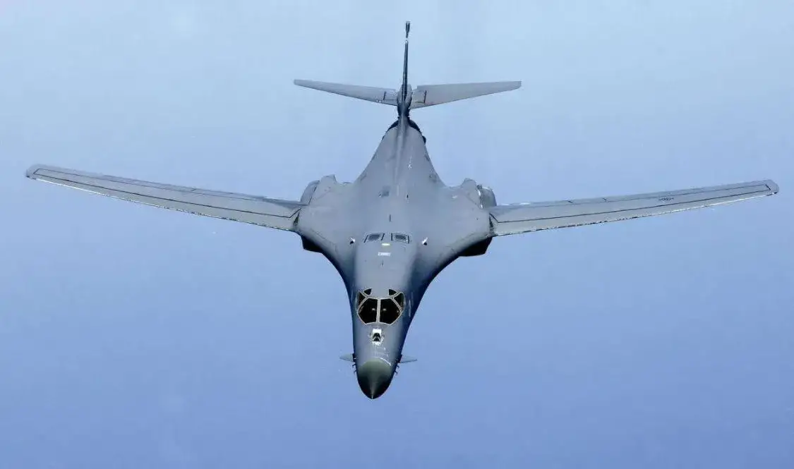 美国B-1“枪骑兵”战略轰炸机:由美国波音公司研制,于1985年开始服役,B-1B轰炸机长44.5米,翼展42米,高度10.4米,安装4台推力75.6千牛的加力涡扇发动机,最大起飞重量216.4吨,最大航程1.2万公里,最大飞行速度1530千米/小时,有三个弹仓,内部载弹量约34吨,外部载弹量约26.7吨。美军现役60架B-1B战略轰炸机。