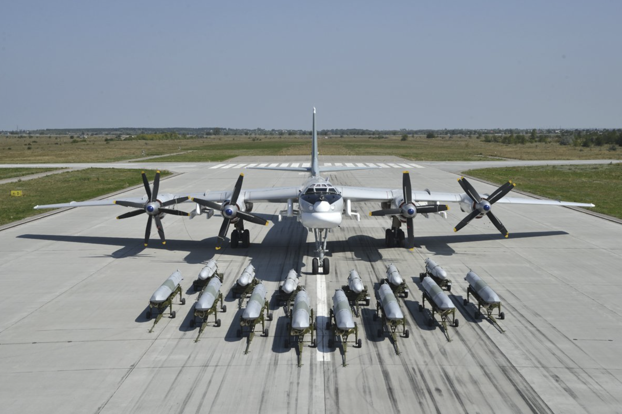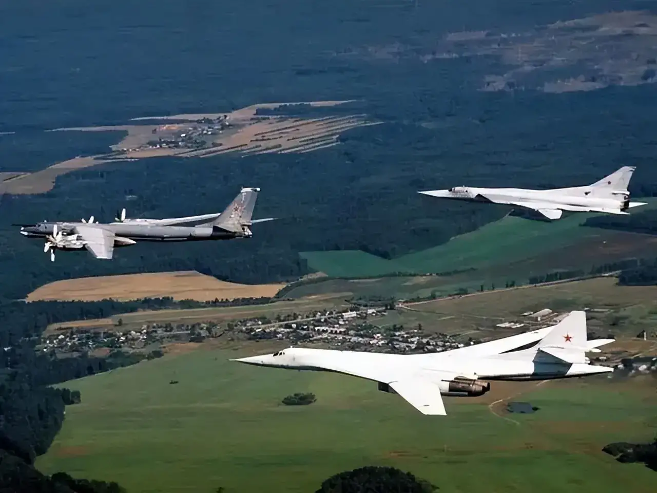 俄罗斯图-95“熊”战略轰炸机:是苏联图波列夫飞机设计局于1951年开始研制的远程重型多用途战略轰炸机,最大速度900km/h,最大飞行距离15000km,续航时间34个小时,战斗半径6500km,飞行高度10500m,最大起飞重量190吨,最大载弹量13吨,长49m,高12.5m,翼展50米;1956年投入使用,1955年开始生产,各种改型持续到1992年,生产了500架,图-95是世界上最快的螺旋桨发动机飞机;俄罗斯空天军现装备有60多架图-95。