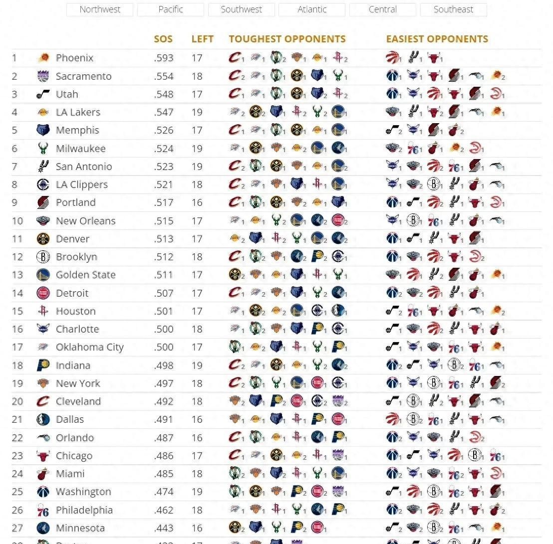 * 太阳:他们最大的竞争对手是独行侠,而独行侠的赛程难度仅为联盟第21,太阳想要进入季后赛,必须啃下这些硬骨头,并且祈祷独行侠掉链子。