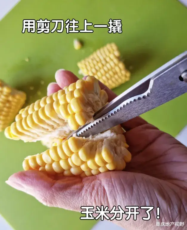 方法特别简单——先把玉米掰成两段,然后用剪刀或筷子戳进玉米芯,稍微用力一扭,玉米立马裂开成两半。这时候再剥,玉米粒就会整整齐齐地掉下来,又快又不费力,剥完还能直接拿去做玉米炒饭、玉米烙,或者插上签子烤着吃,方便得很!