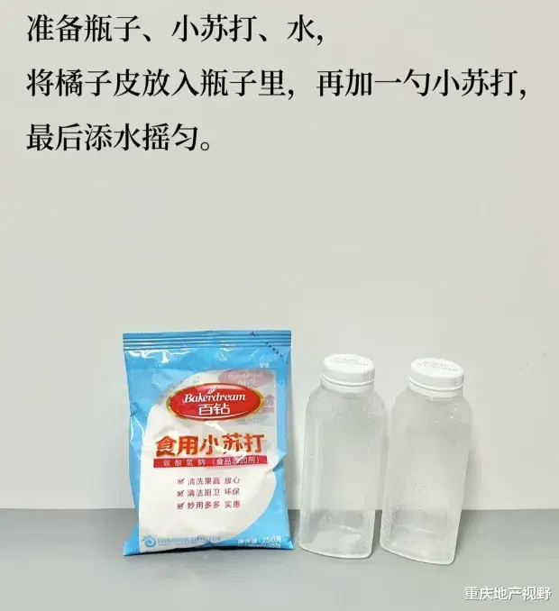 吃完的橘子皮,可以切成细丝,加入一点小苏打和清水,搅拌均匀后倒进罐子里密封好,然后放进冰箱静置七天。
