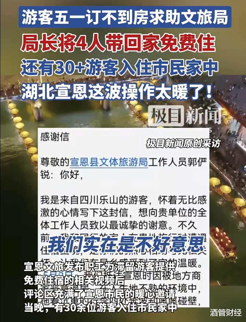 5月2日晚上,自驾来到湖北恩施州宣恩的王女士,因为没订到酒店,就找宣恩县文旅局求助,最终受到了当地文旅系统的热情接待。她们一行四人入住到宣恩县文旅局局长王菊芳家。还有部分游客分流到其他员工家中。