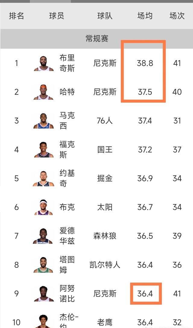 而NBA出场时间前十的球员,都来自尼克斯,排在第一位的是,大乔布里斯奇,场均38.8分钟。排在第二位的是哈特,场均37.5分钟。排名第九的是阿奴诺比,场均36.4分钟。已经很直白了,如果觉得自己身体好,可以去尼克斯打球。