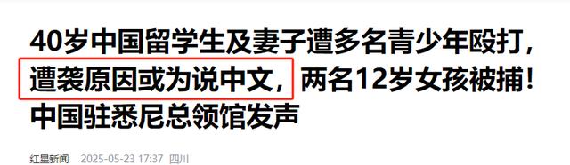 红星新闻-2025-05-23-40岁中国留学生及妻子遭多名青少年殴打,遭袭原因或为说中文,两名12岁女孩被捕!中国驻悉尼总领馆发声