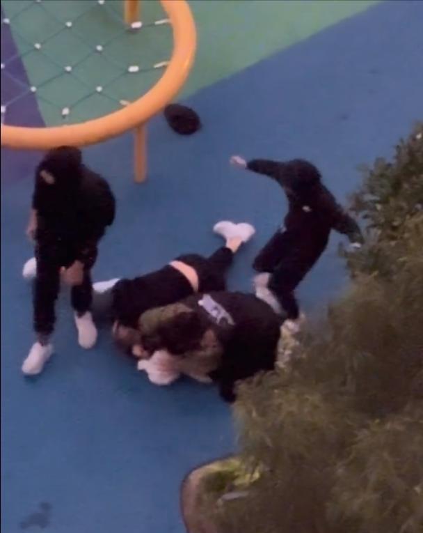 整个过程持续近一分钟,直到路人呵斥,施暴者才四散逃跑。