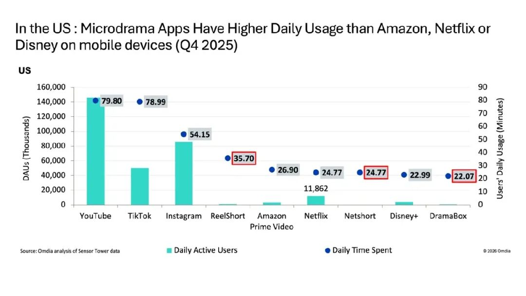 更惊人的是用户黏性。Omdia数据显示,美国用户在短剧App上的日均使用时长已超越Netflix、Disney+等传统流媒体平台——ReelShort用户日均使用时长达35.7分钟,而Netflix只有24.8分钟。