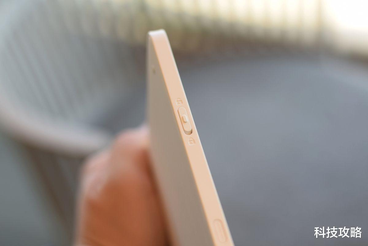 机身侧面的物理锁定键和一体式磁吸笔位,是我用下来最惊喜的小设计。一键开关,往上拨就是防误触锁定,孩子画完的作品、你记好的清单,再也不会不小心一键清空;往下拨解锁,就能正常清屏书写,老人小孩都能一秒上手。