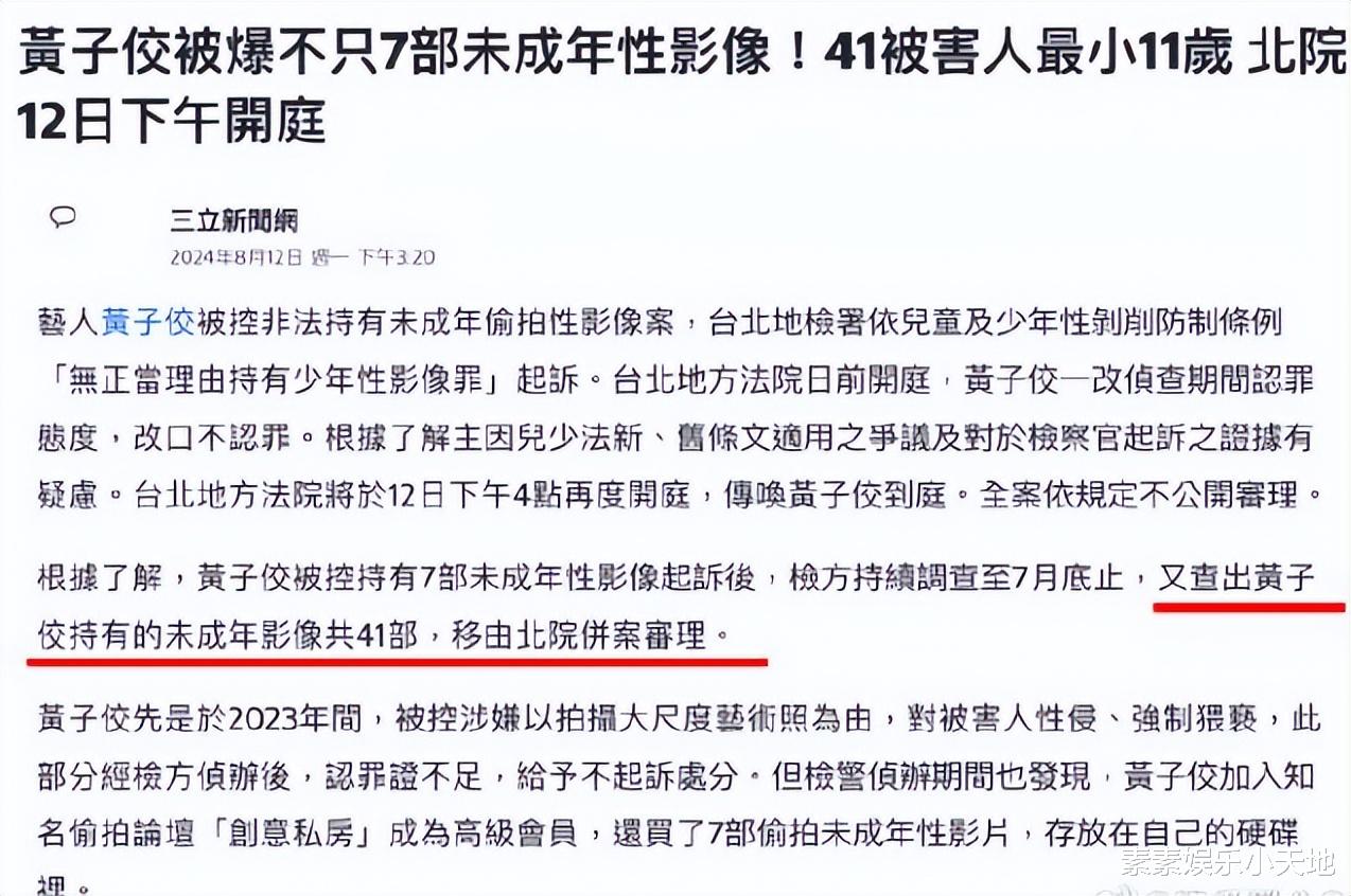 目前黄子佼的罪行加重,原来法院对他持有7部少女性影像,判罚他犯《儿童及少年性剥削防制条例》。