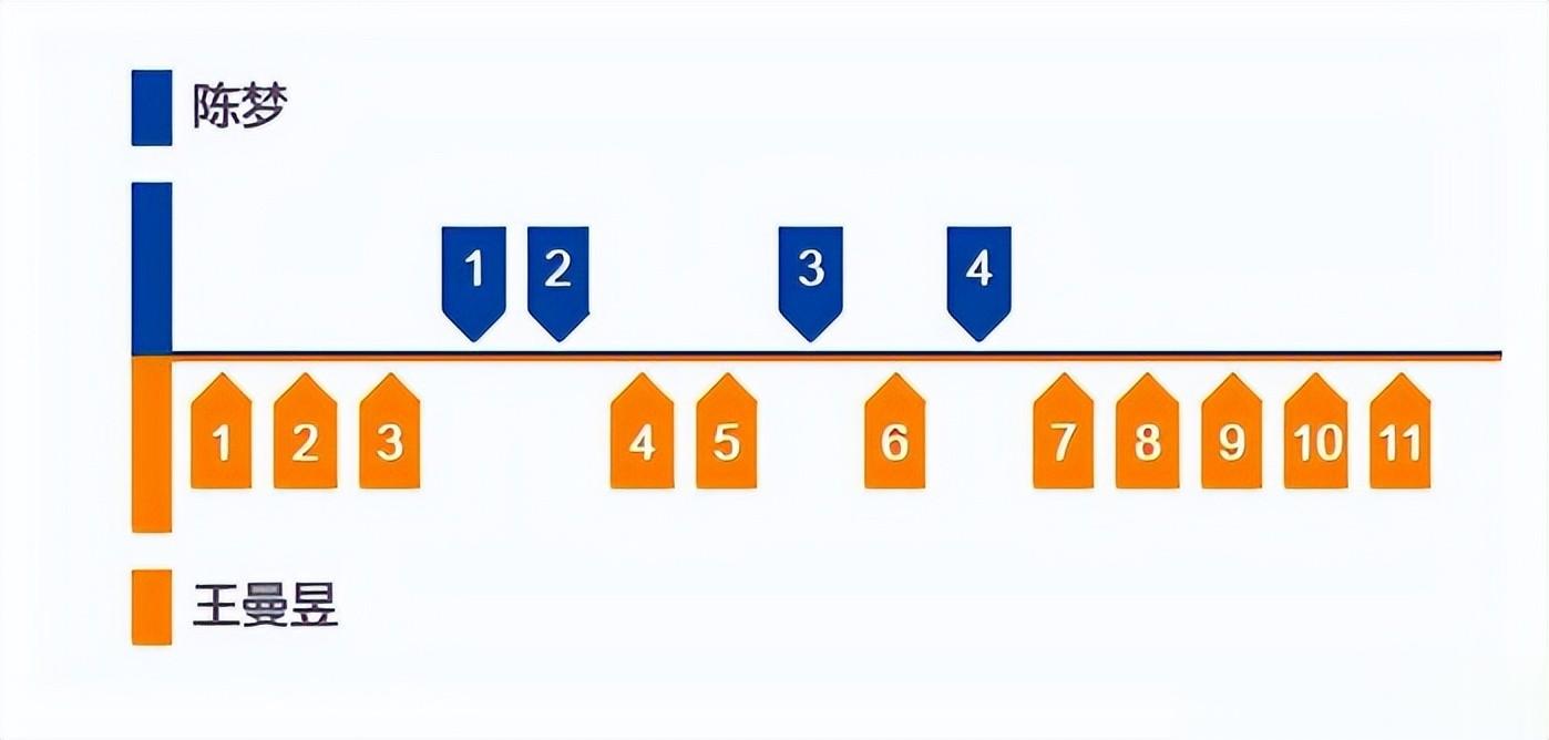 第三局,王曼昱5-1领先。期间因双方擦汗时间较长,裁判进行催促。陈梦追至3-5后,王曼昱再下一波6-0,以11-3拿下第三局。