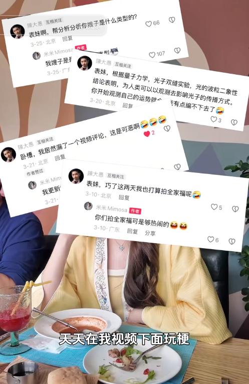 米米的表哥不仅是天生的喜剧人,还兼职给她当摄影师,平日里,他还会经常在米米的视频评论区玩梗,逗得大家哈哈大笑。