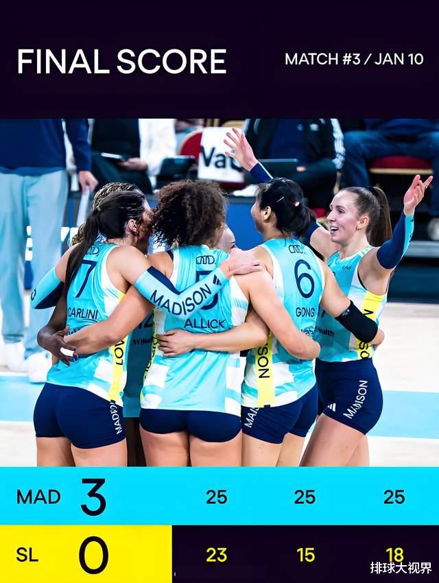 LOVB美国女排联赛联赛第二季,中国女排队长龚翔宇登场亮相!最终麦迪逊3:0轻取盐湖城队,三局比分为:25-23、25-15、25-18。