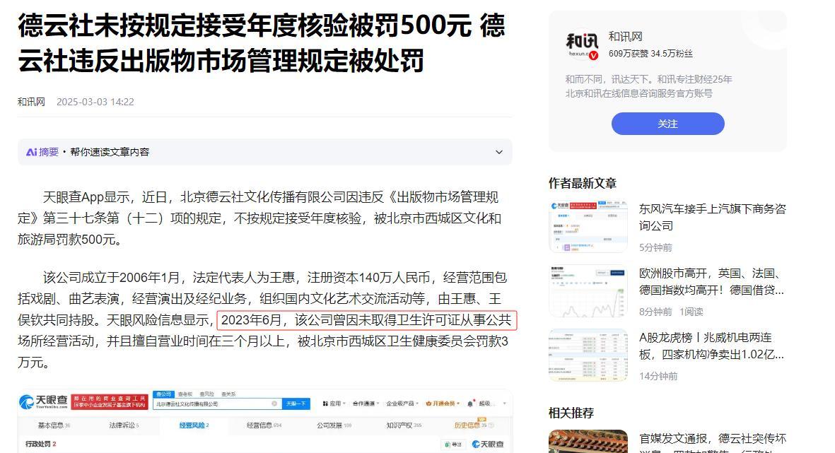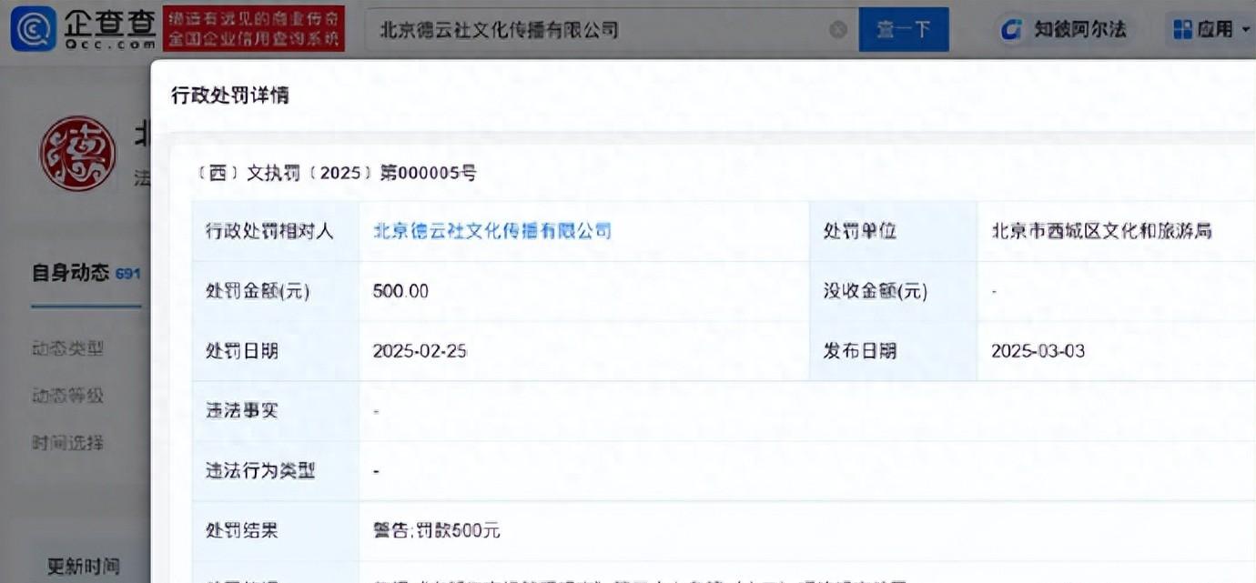 2023年6月,德云社因无证经营被罚三万元;2024年3月,又因未按规定接受年度核验被罚五百元。
