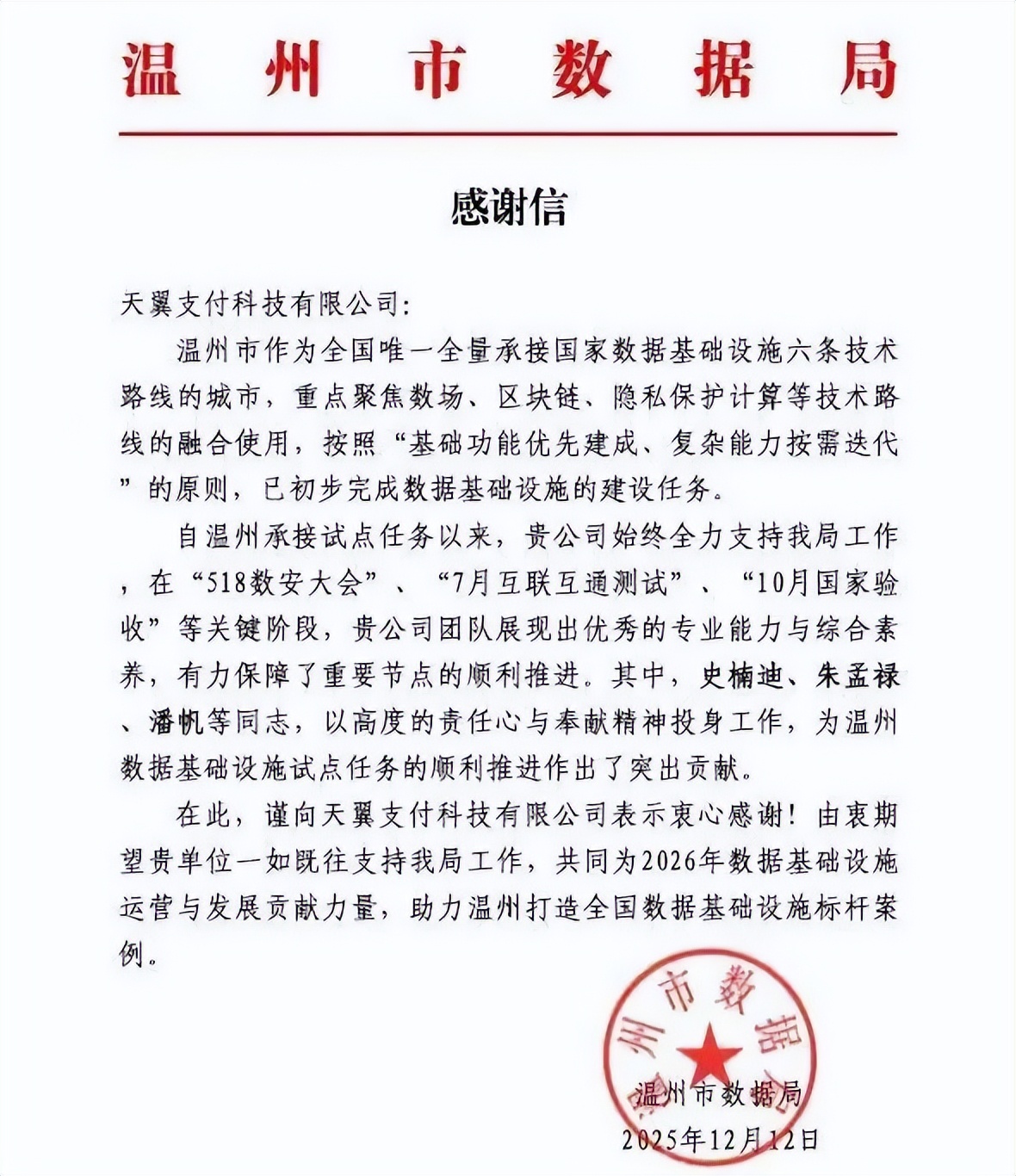 近日,中国电信集团有限公司旗下子公司天翼支付科技有限公司(以下简称:中国电信翼支付)收到来自温州市数据局的感谢信。信中对中国电信翼支付在温州承接国家数据基础设施试点任务过程中给予的全方位、高质量支撑表示衷心感谢,并对其团队展现出的专业能力与责任担当予以高度认可。