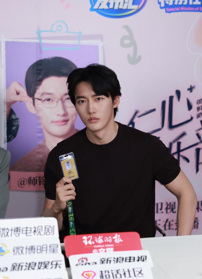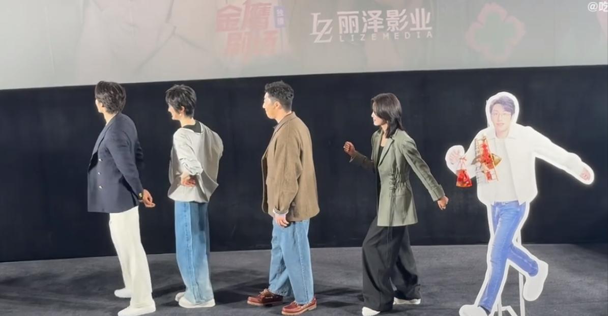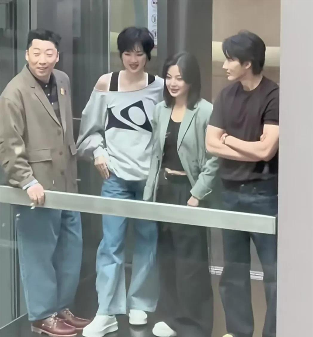 值得一提的是,张子贤和师铭泽两位男士非常绅士地将中间位置留给了两位女主演,四人站在透明升降楼梯上,都双手交叉抱于胸前,颇有剧组的“团魂”感。