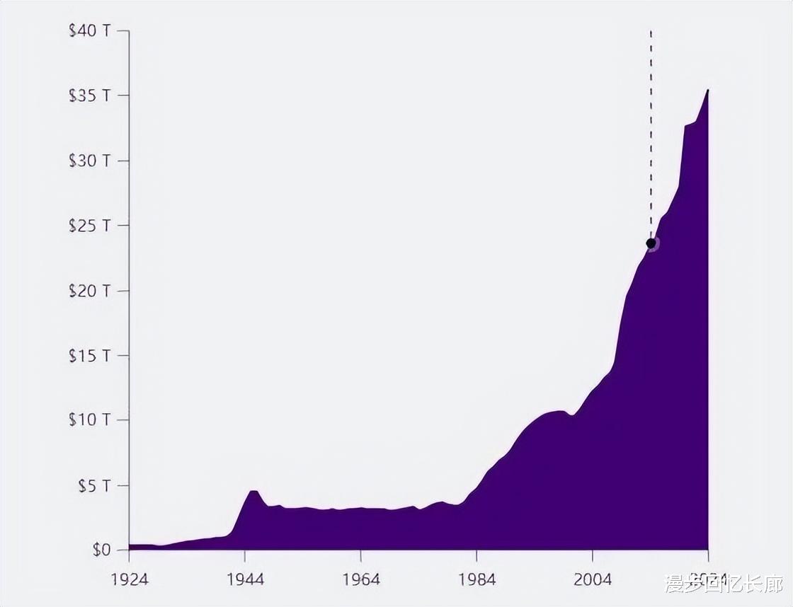 2014年美国国债总额18万亿美元,十年后涨到了36万亿,等于说十年翻了一倍