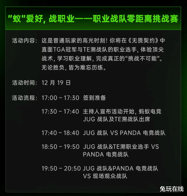 “蚁”爱好,战职业——职业战队零距离挑战赛(12.19):17:00起,活动将按流程开启:签到准备后,JUG战队与TE溯战队将率先亮相,随后依次展开“JUG vs PANDA电竞战队”“TE溯职业选手+JUG vs PANDA电竞战队”“JUG+PANDA战队 vs 现场观众战队”三场对抗,全程开放观赛,让玩家沉浸式感受职业赛事的氛围。