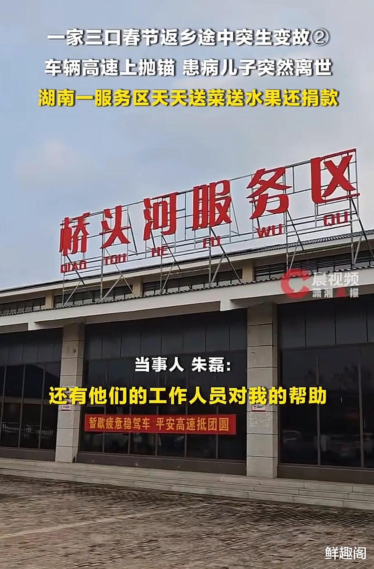 然而2026年2月13日,车辆行驶到湖南涟源市时,突然发生了故障。朱磊只好将车停在长芷高速长沙方向的桥头河服务区,等待维修。俗话说“屋漏偏逢连夜雨”,第二天(2月14日),朱磊外出寻找维修师傅修车,可是就在他离开的那段时间里,儿子的病情突然恶化。