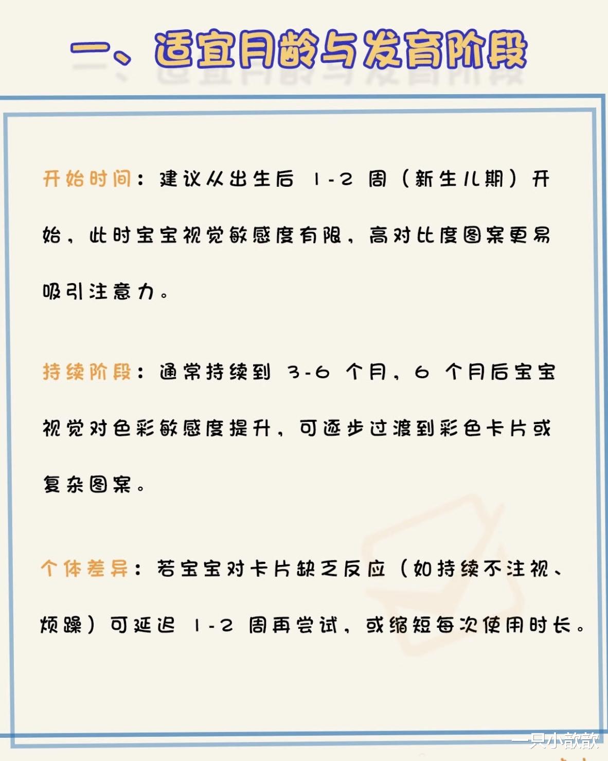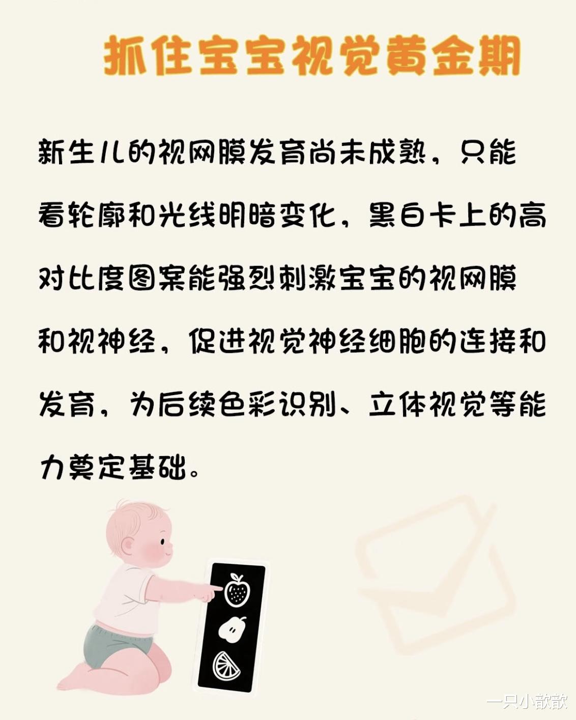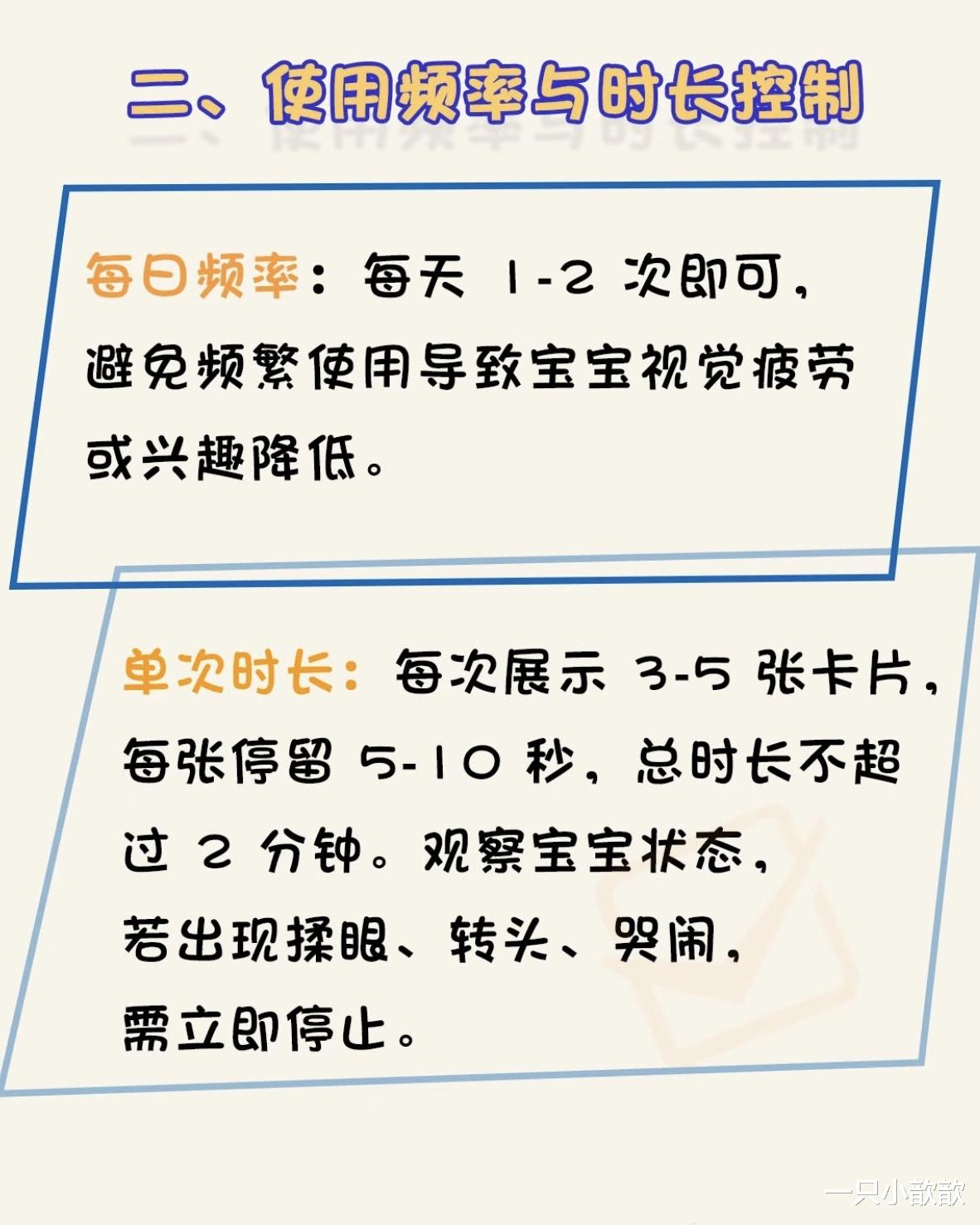 误区二:换卡太快,眼睛跟不上节奏,“这张看3秒,那张看5秒,宝宝是不是看得越多越聪明?”很多家长像“翻书机器一样快速切换卡片,结果宝宝还没看清图案,卡片已经换了,这种走马观花式训练,反而破坏专注力!0-3个月的宝宝,视觉追踪能力还在发育中,需要时间处理信息。如果换卡太快,他的眼睛就像卡顿的手机屏幕,不仅无法形成有效刺激,还可能因为频繁调整焦距而疲劳。应该每次只展示1-2张卡片,给宝宝足够时间观察,至少10-15秒,观察他的反应:如果眼神跟随卡片移动,或小手试图抓握,说明他在认真研究;如果眼神飘走或打哈欠,说明看够了,再换下一张,每天训练3-5分钟即可,别贪多!