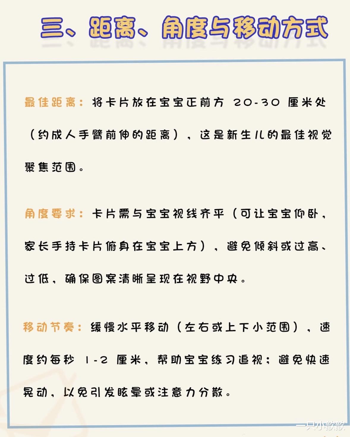 误区一:距离太近,新手爸妈总怕宝宝看不清,举着卡片恨不得贴到脸上,这恰恰是最大的坑!新生儿的视力只有成人的1/30,出生时只能看清20-30厘米内的物体,类似“高度近视”,如果卡片离得太近,小于20厘米,宝宝需要拼命聚焦,眼睛肌肉长期紧绷,就像成年人一直盯着手机屏幕看半小时,又累又酸!更严重的是,长期近距离用眼可能影响宝宝未来调节视力的能力,增加近视风险。正确做法应该把卡片放在宝宝眼睛正前方25-30厘米处,约一臂长,这个距离刚好在他的清晰视野内,既能看到细节,又不会过度用眼。观察宝宝反应:如果他盯着卡片看,眼神专注不眨眼,说明距离合适;如果频繁扭头或闭眼,可能是太近了,赶紧往后挪一挪。