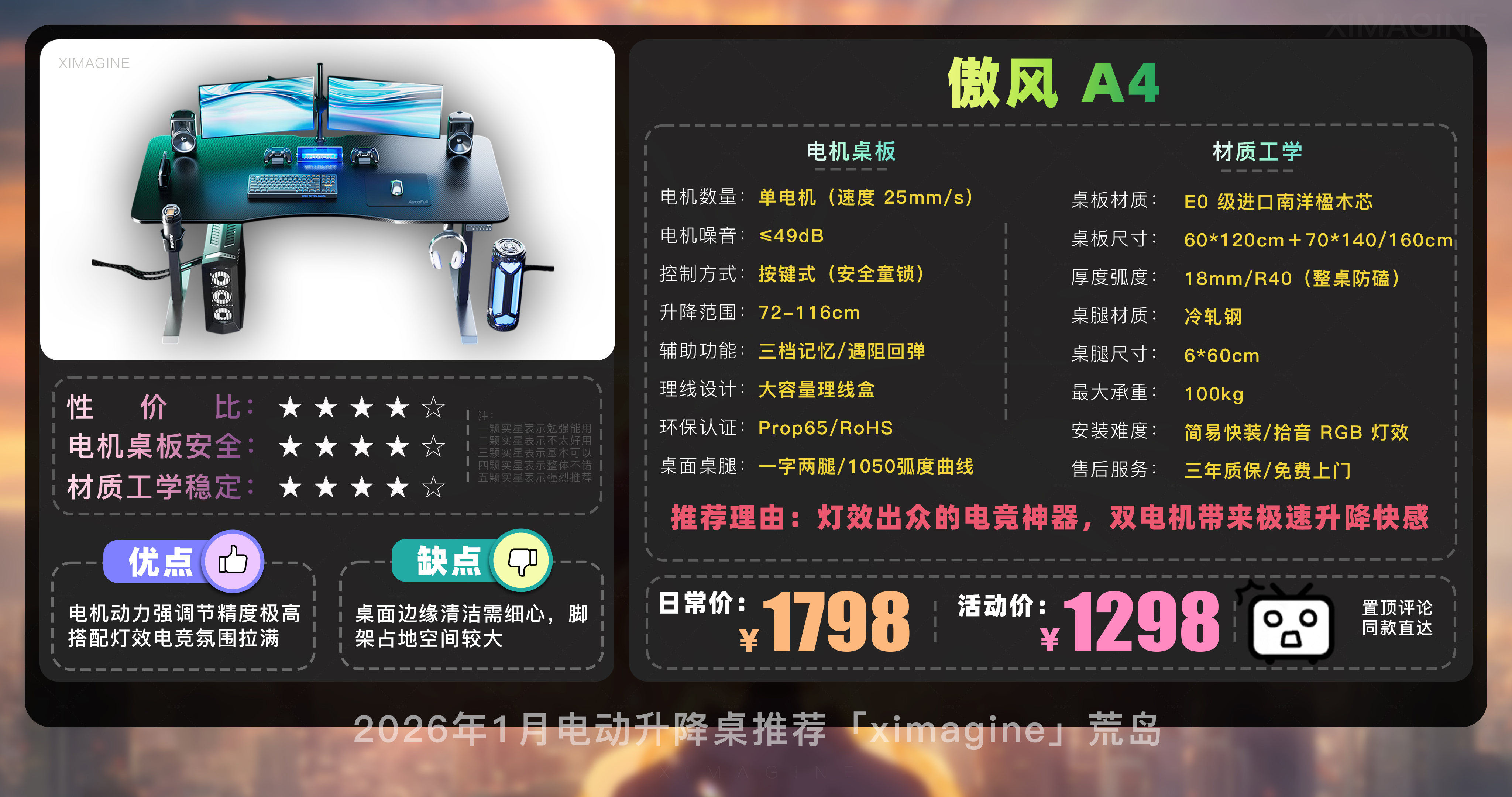 欢迎来到2026年1月电动升降桌推荐合集!我是本期的桌面课代表「ximagine」不知道你有没经历过,伏案剪辑或开黑几小时后,脖子僵得像铁板腰酸得直不起来?长期久坐不仅消耗创作热情,更是在透支脊柱健康,近来电动升降桌成了新宠,它提供了坐站交替的自由,通过高度的动态调整,让身体在专注模式和放松模式间无缝切换。但这玩意儿从几百到几千块都有,长得还都差不多,到底该怎么挑?这里总结了三个黄金法则:一看电机动力,单电机够用双电机更好,好的电机不只是升降快关键还要稳;二看板材工学,追求性价比选碳纤维贴面,注重健康实木芯是首选,还要留意桌腿厚度和结构;三看细节收纳,一张好桌子不应该只是个升降台,还要看它的理线系统够不够聪明,它的遇阻回弹灵不灵敏。这期内容我将十六款电动升降桌按三个价位段,无论是追求性价比的学生,还是想要一步到位的硬核玩家,希望能帮你找到那张天命之桌,话不多说,正餐开始!