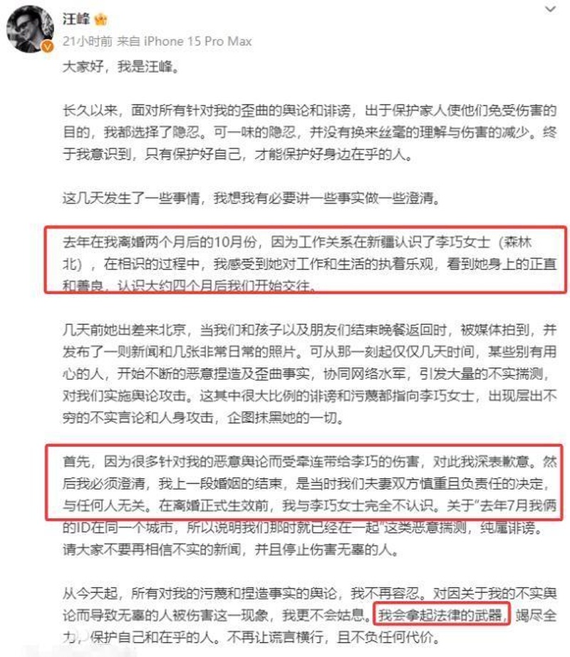 在长文里,汪峰详细讲了他和森林北相识的过程。他说两人是在离婚后才认识的,经过四个月的了解才开始交往。而且他还特别强调和章子怡的离婚那是双方慎重考虑后的负责任的决定了,和别人没关系。在离婚生效前,他和森林北压根就不认识,所谓的“婚内出轨”纯粹是无稽之谈。汪峰还向森林北道了歉,觉得自己让她陷入了舆论漩涡,遭受了不实攻击。这回应,可见他对森林北那是满满的维护和爱意啊,这也展现出他作为一个男人的担当。