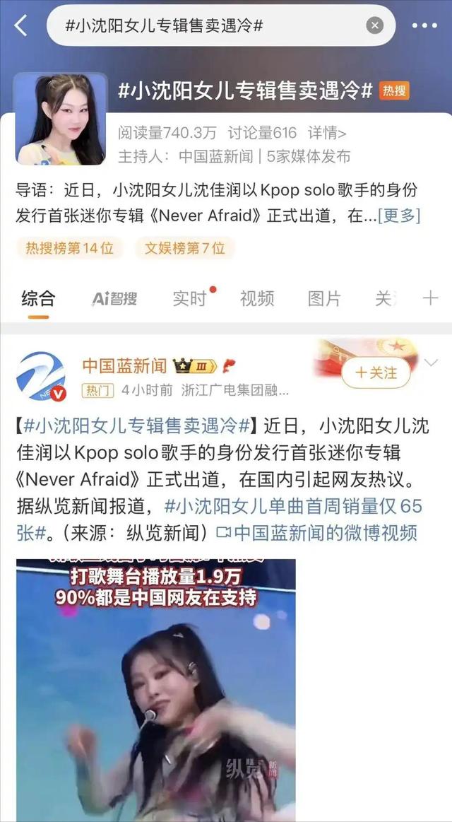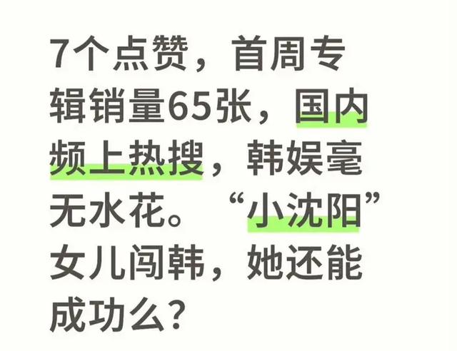 小沈阳女儿沈佳润在韩国发了第一张个人专辑《Never Afraid》,结果有人爆料说:这专辑在韩国那边首周才卖了的65张实体,销量少的可怜。