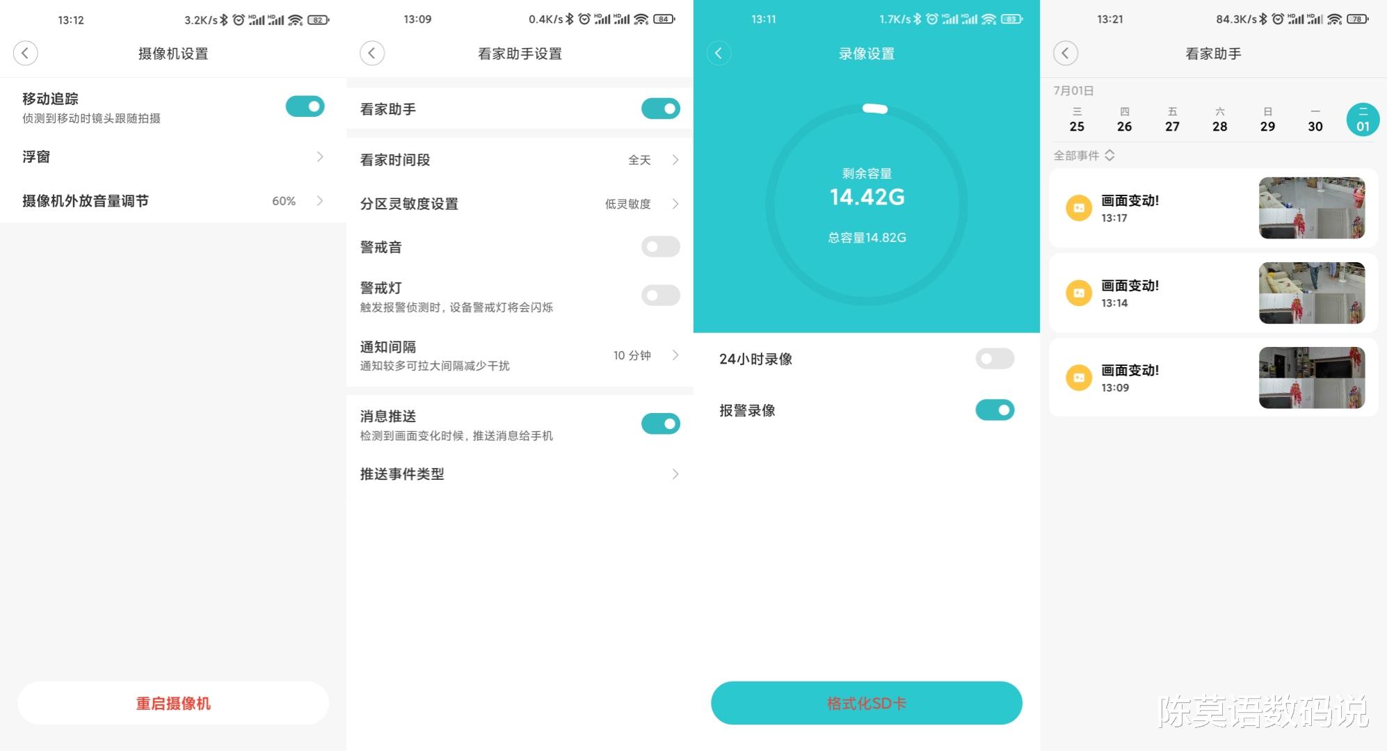 智能家居产品接入米家的好处就是不用单独APP,我家所有的摄像机全是米家一个APP就能查看控制,方便还省手机内存。由于双摄的存在,查看监控画面就变成了上下双镜头画面,两个画面可同时预览和回放,颇有点坐在监控室中运筹帷幄的感觉。注意看一下截图中的前两张监控画面,室内不开灯弱光环境下的智能全彩高清夜视功能让弱光环境下的监控画面和开灯状态下几无差异。